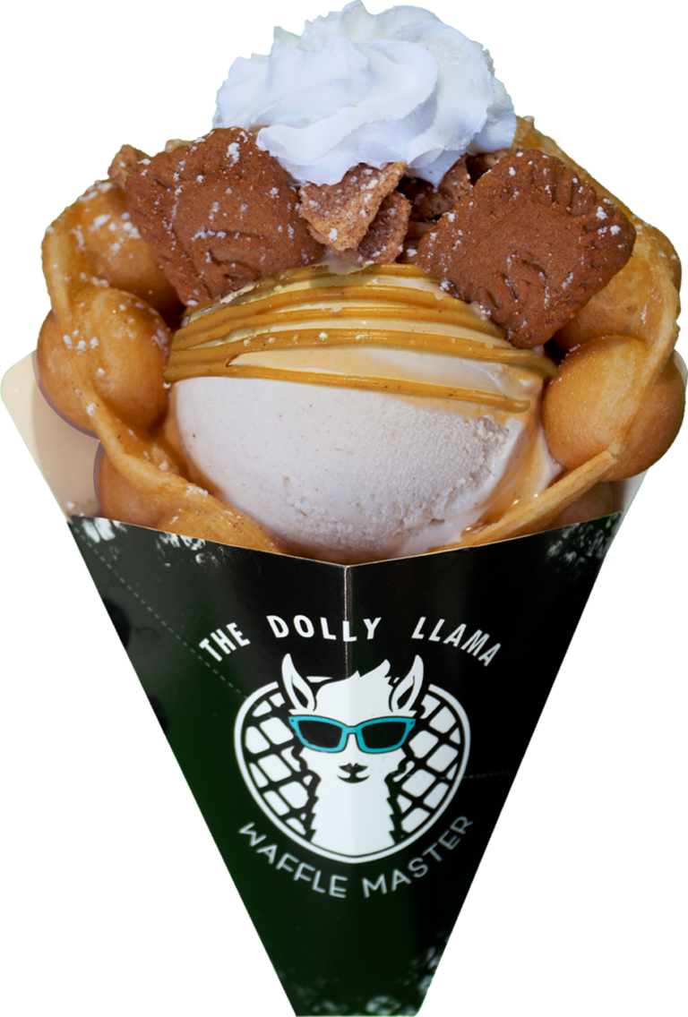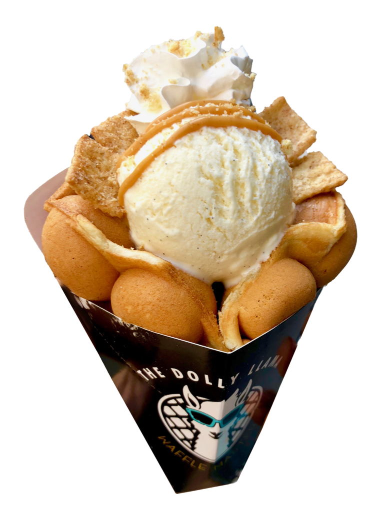 Signature Bubble Waffle topped with Horchata ice cream, speculoos cookies, cinnamon toast crunch and caramel sauce.