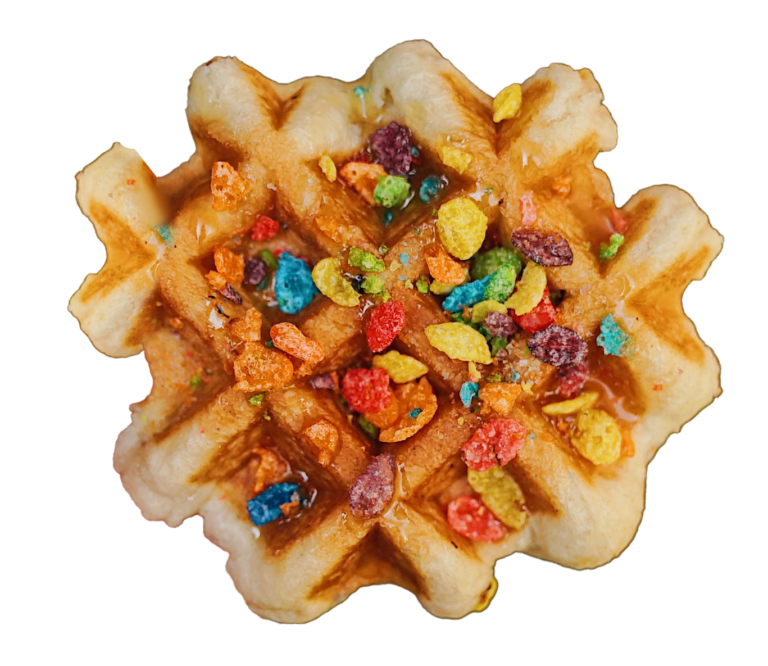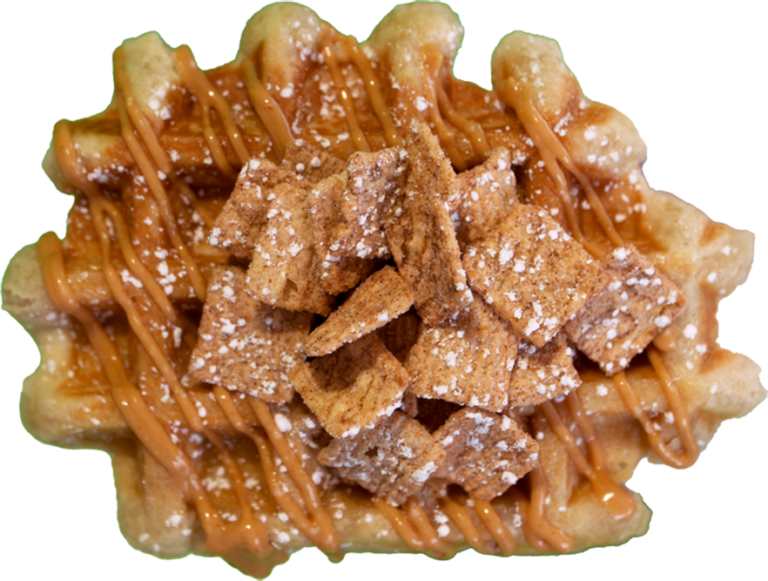 Signature OG Liege Waffle topped with peanut butter and cinnamon toast crunch.