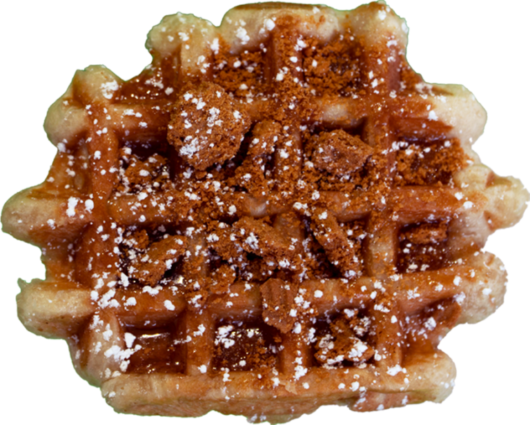 Signature OG Liege Waffle topped with maple syrup and speculoos cookie crumbs.