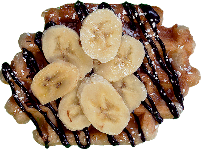 Signature OG Liege Waffle topped with chocolate syrup and fresh bananas.
