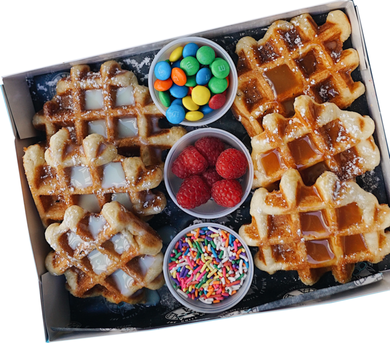Box of 6 or 12 Mini-OG Liege Waffles sprinkled with powdered sugar. Add ice cream, sauce and toppings.