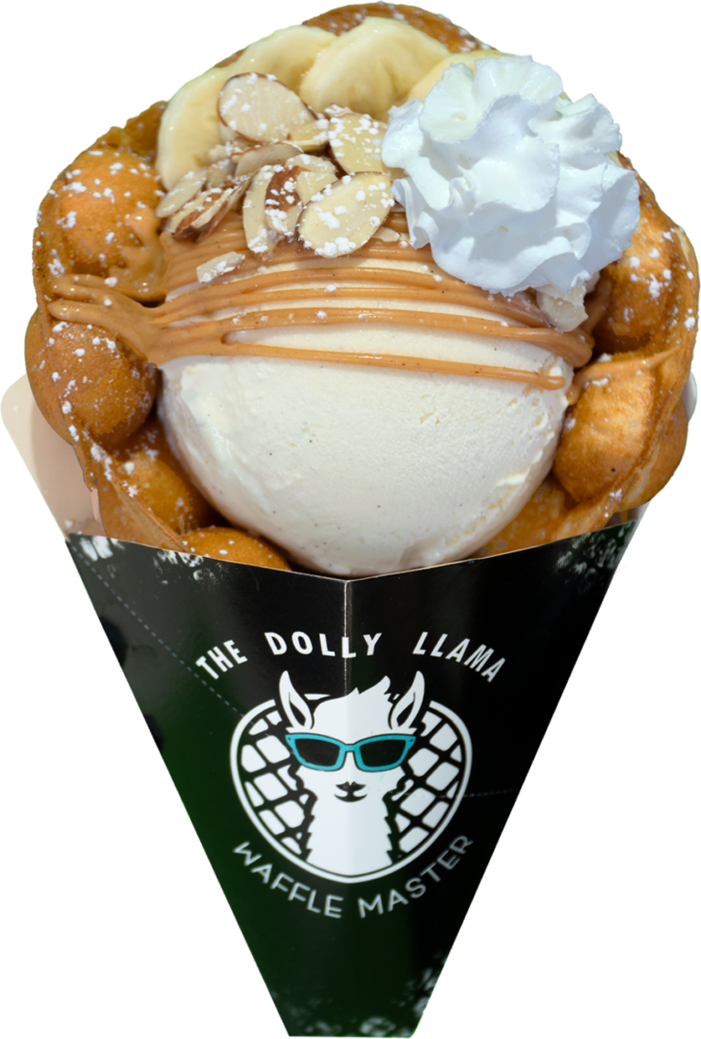 Signature Bubble Waffle topped with Vanilla ice cream fresh bananas, almonds and peanut butter sauce.